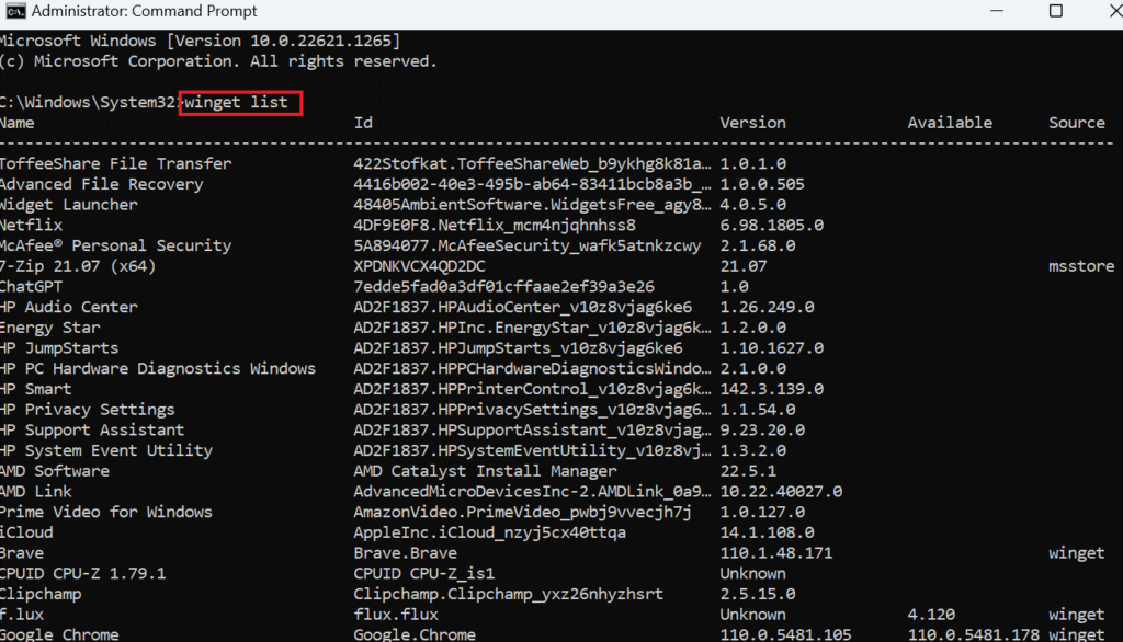 - 次のコマンドを入力して、プレスします入力WingetがPCにインストールされているすべてのアプリケーションを検索できるようにするには:Wingetリスト