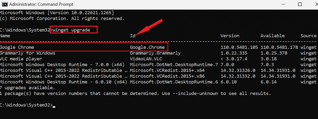 - タイプ 'Wingetアップグレード(ID) 'アプリケーションをアップグレードするコマンド。