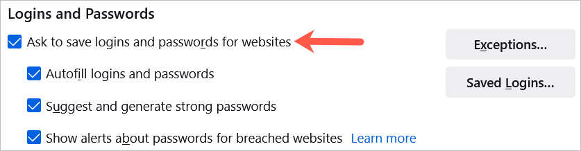 - セクションの最初のボックスを確認してくださいWebサイトのログインとパスワードを保存するように依頼します。
