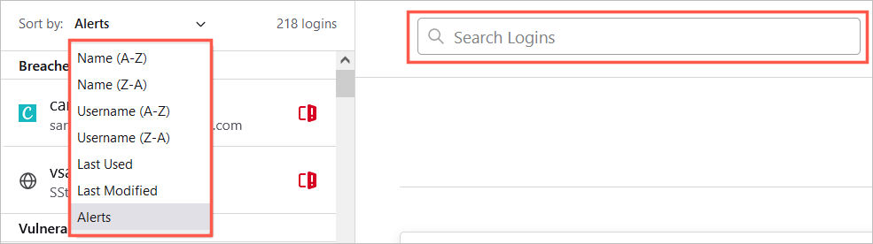 左上に、次のドロップダウンボックスを使用します並べ替えサイト名またはユーザー名、最後に使用または変更された、またはアラートによってパスワードをアルファベット順に表示するには。