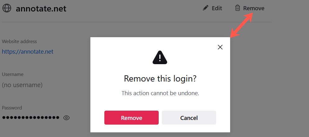訪問しなくなったサイトなどのログインを削除するには、左側のリストでそれを選択して選択します取り除く右側に。選択して削除を確認します取り除くもう一度。