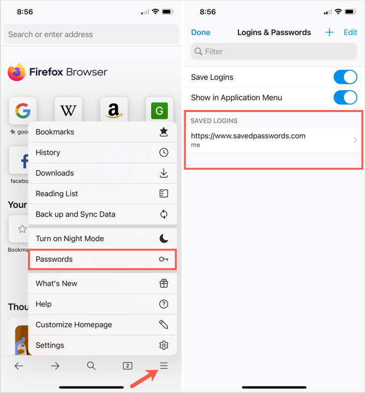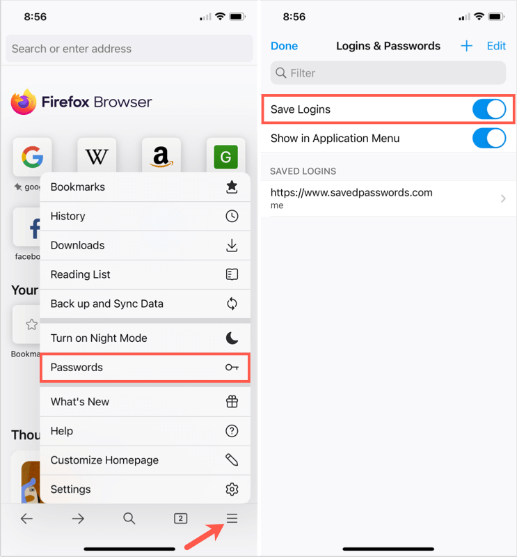 iPhoneで、タップしますメニューFirefoxのボタンと選択パスワード。のトグルをオンにしますログインを保存します。