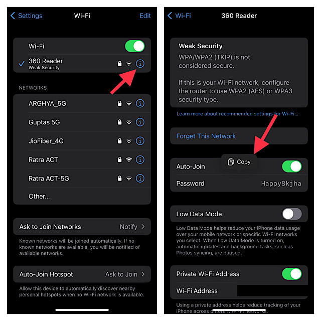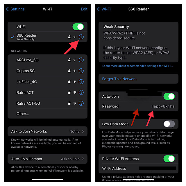 4。次に、パスワードフィールドをタップして、Face IDまたはTouch IDを介して認証を成功させた後、Wi-Fiパスワードを表示します。