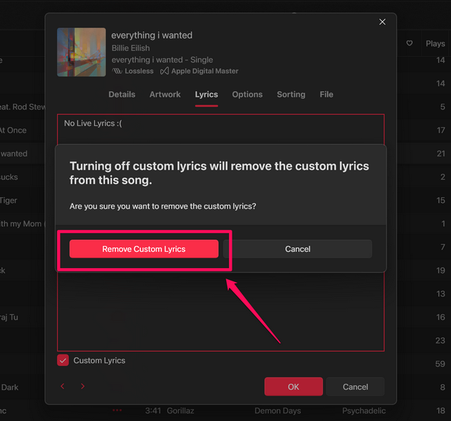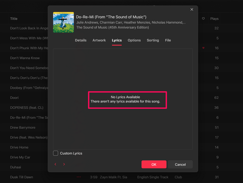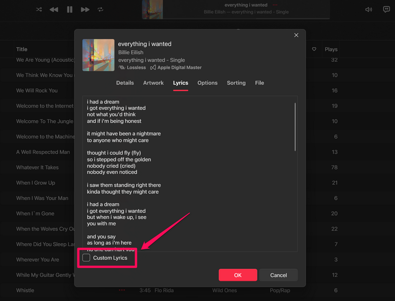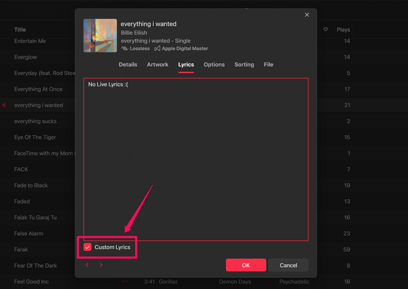 13。したがって、rをしたい場合曲のカスタム歌詞をemoveしますApple Musicアプリでは、[歌詞]タブに移動します曲のプロパティウィンドウとカスタム歌詞オプションのボックスを外しますそこから。