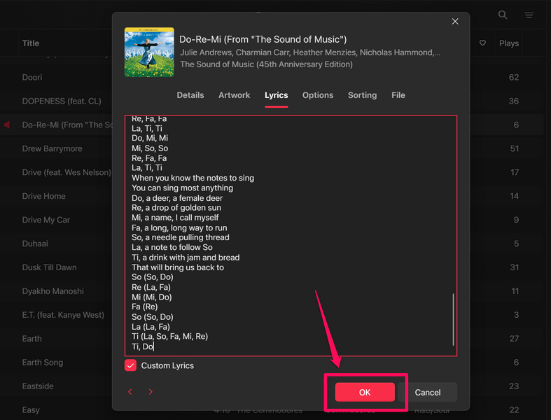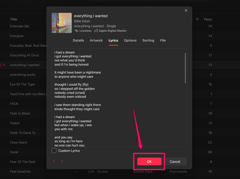 9。完了したら、クリックしますわかりました曲のカスタム歌詞を保存するボタン。