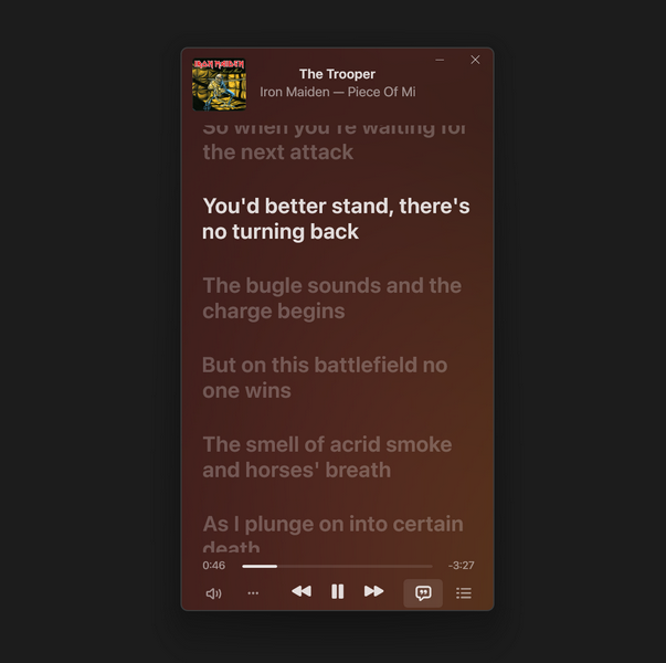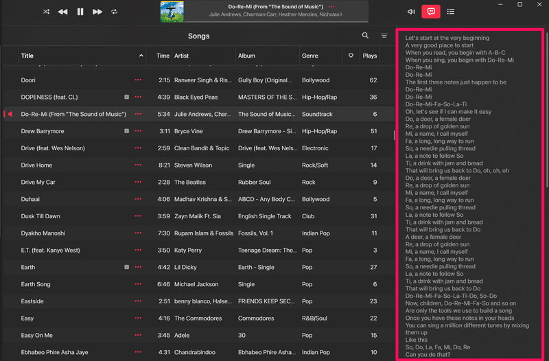 はい、曲の歌詞をプレーンテキストとして見るだけでなく、WindowsのApple MusicアプリでKaraokeスタイルのライブ歌詞パネルを入手できます。