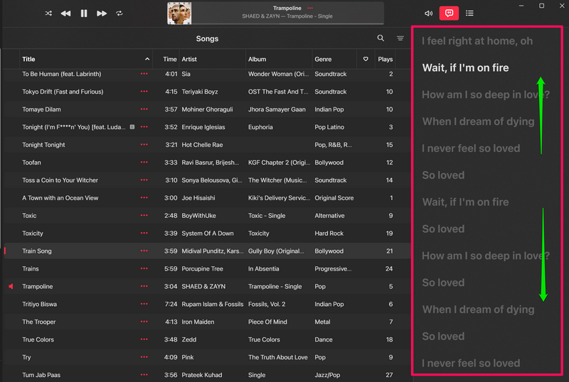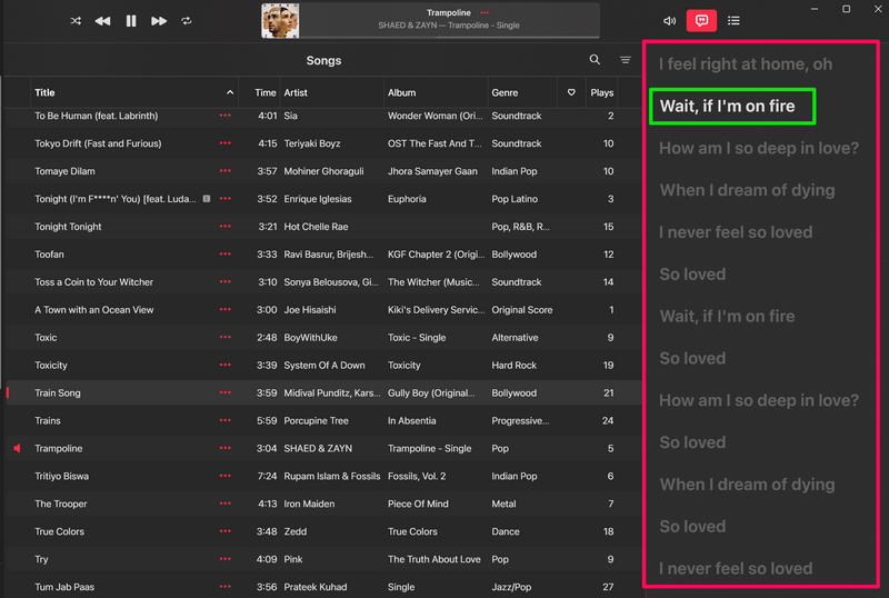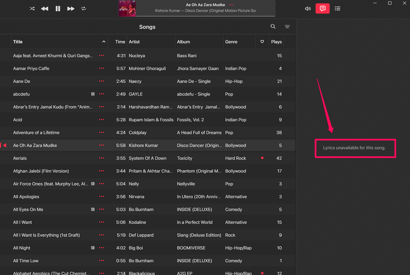 これは、Windows 11 PCまたはラップトップのApple Musicアプリで、曲の歌詞をプレーンテキストとして見る方法です。さて、曲の歌詞を編集し、それに独自の歌詞を追加したい場合は、次のセクションをチェックしてください。