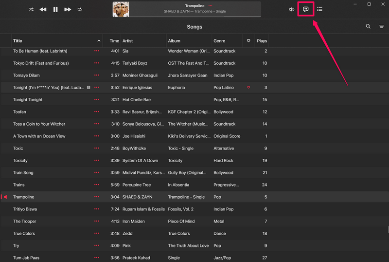 3。再生を開始したら、クリックします歌詞ボタン上記のボタンパネル。
