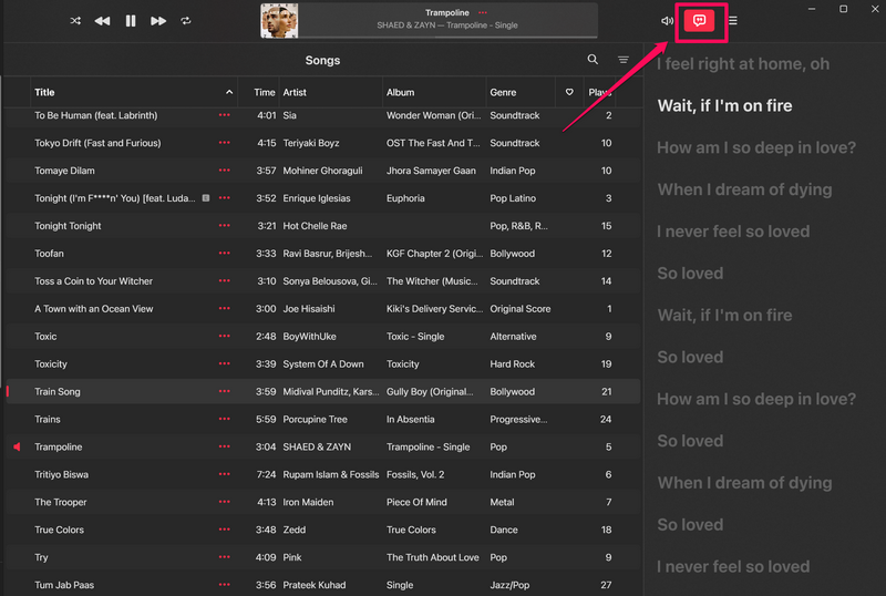9。これで、Windows 11のApple Musicアプリの曲のライブ歌詞パネルを閉じたい場合は、歌詞ボタンあなたはそれを開いた。