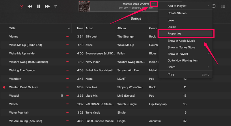 3。または、クリックすることもできますアクション(…)ボタン現在の再生セクションの現在の曲と[プロパティ]オプションを選択しますアクションメニューから。