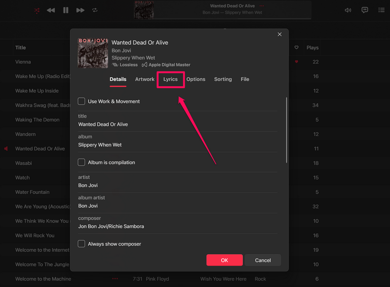 3。に行きます歌詞タブ曲のプロパティウィンドウで。