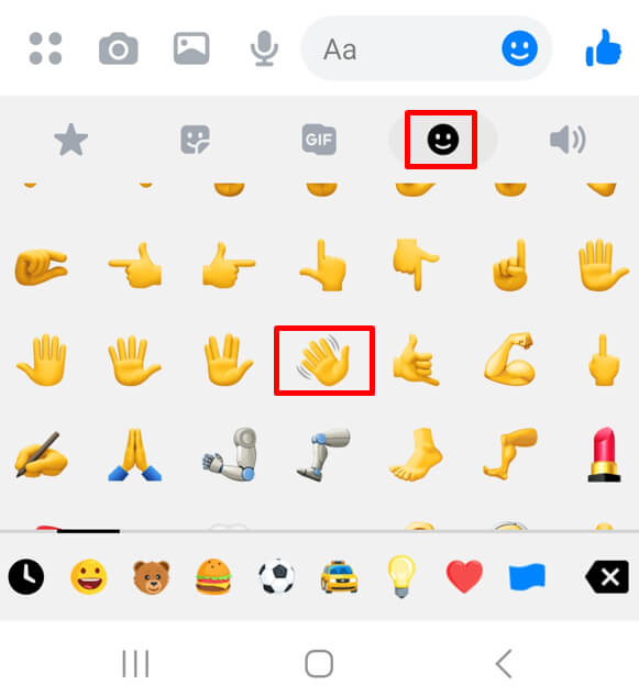 - 絵文字メニューが開きます。あなたが見つかるまで下にスクロールします波アイコン(手を振る手で表されます)、タップします。