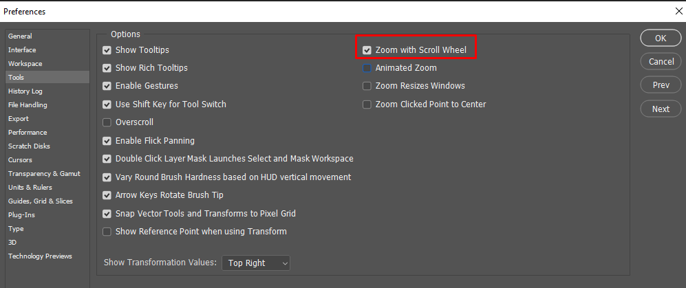 - 次のチェックボックスをチェックしますスクロールホイールでズームします。
