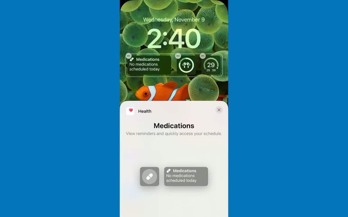 これで、iOS 16.2ベータ2の薬ウィジェットは、その情報をユーザーのロック画面にもたらします。ユーザーは、ヘルスアプリを起動することなく、ロック画面を一目で薬のスケジュールを表示できます。