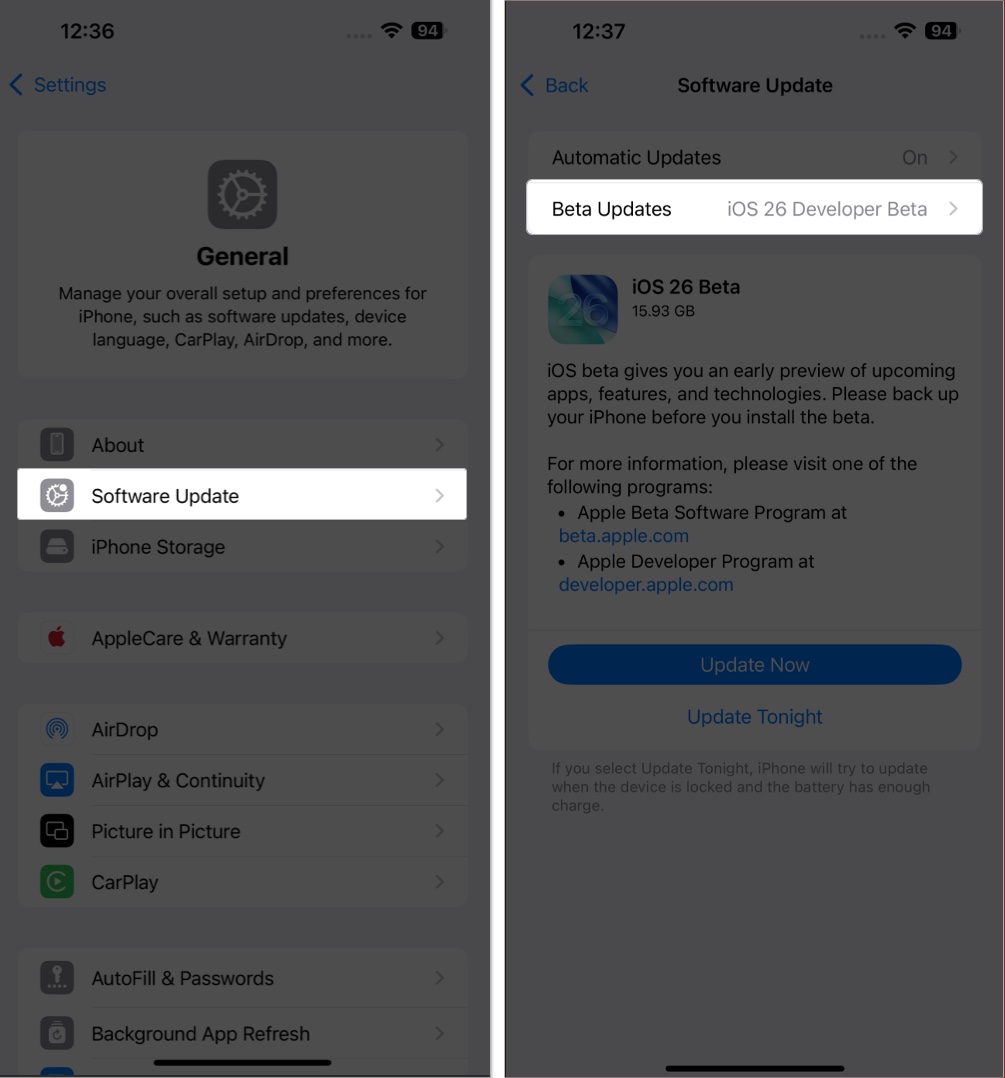 ソフトウェアアップデートでiOS 26が表示されていない場合は、正しいことを確認してくださいベータプログラム。パブリックベータユーザーは、開発者ベータ版を取得しません。