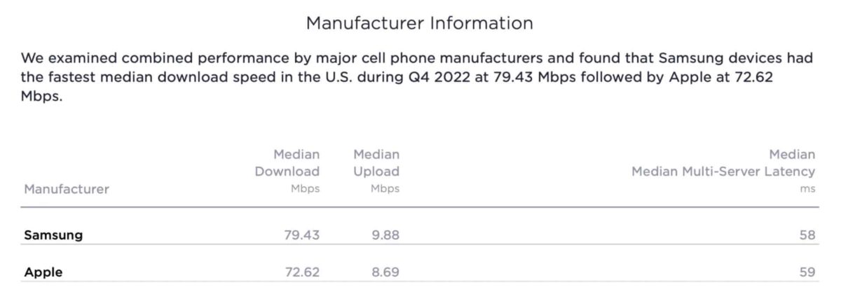 その他のテスト結果は、サムスンのスマートフォンが「すべてのiPhoneと約7 Mbpsの中で最速のダウンロード速度」で全体的にリードしていることを示しています。