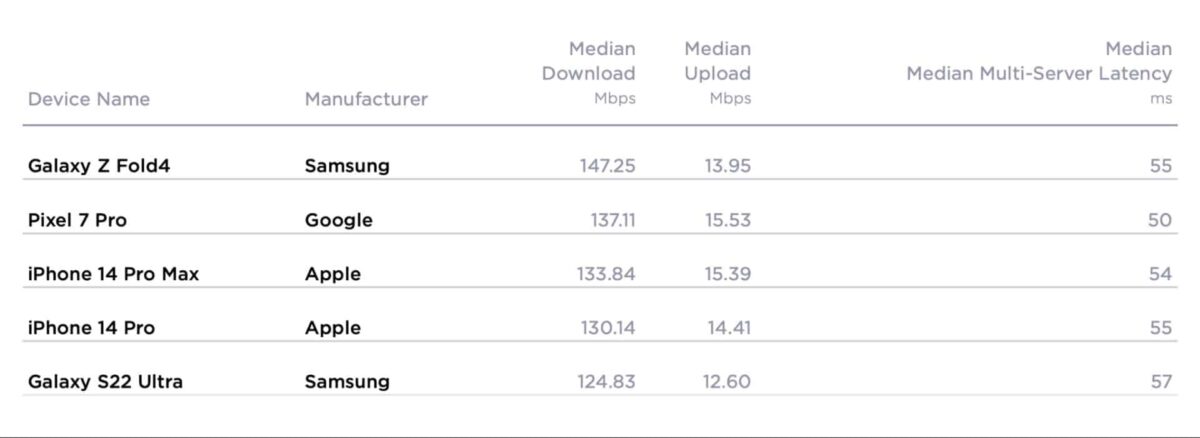に従って報告、iPhone 14 Pro Maxは、Samsung Galaxy Z Fold4に最速のダウンロード速度速度を失い、147.24 Mbpsの中央値ダウンロード速度をトッピングしました。 GoogleのPixel 7 Proは137.11 Mbpsで2位にランクされました。 iPhone 14 Pro Maxのダウンロード速度の中央値は147から133Mbpsに低下し、Galaxy Z Fold4とPixel 7 Proがそれぞれ1番目と2番目のスポットを撮ることができました。