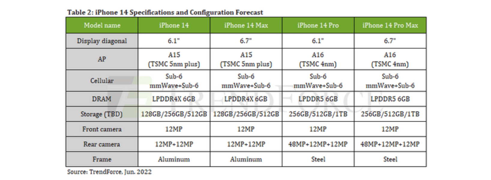 によると共有iPhone 14の仕様と構成予測、iPhone 14 Pro、およびiPhone 14 Pro Maxは、256GB、512GB、および1TBストレージオプションで利用できます。一方、iPhone 14およびiPhone 14 Maxは、128GB、256GB、および512GBのストレージオプションで利用できます。