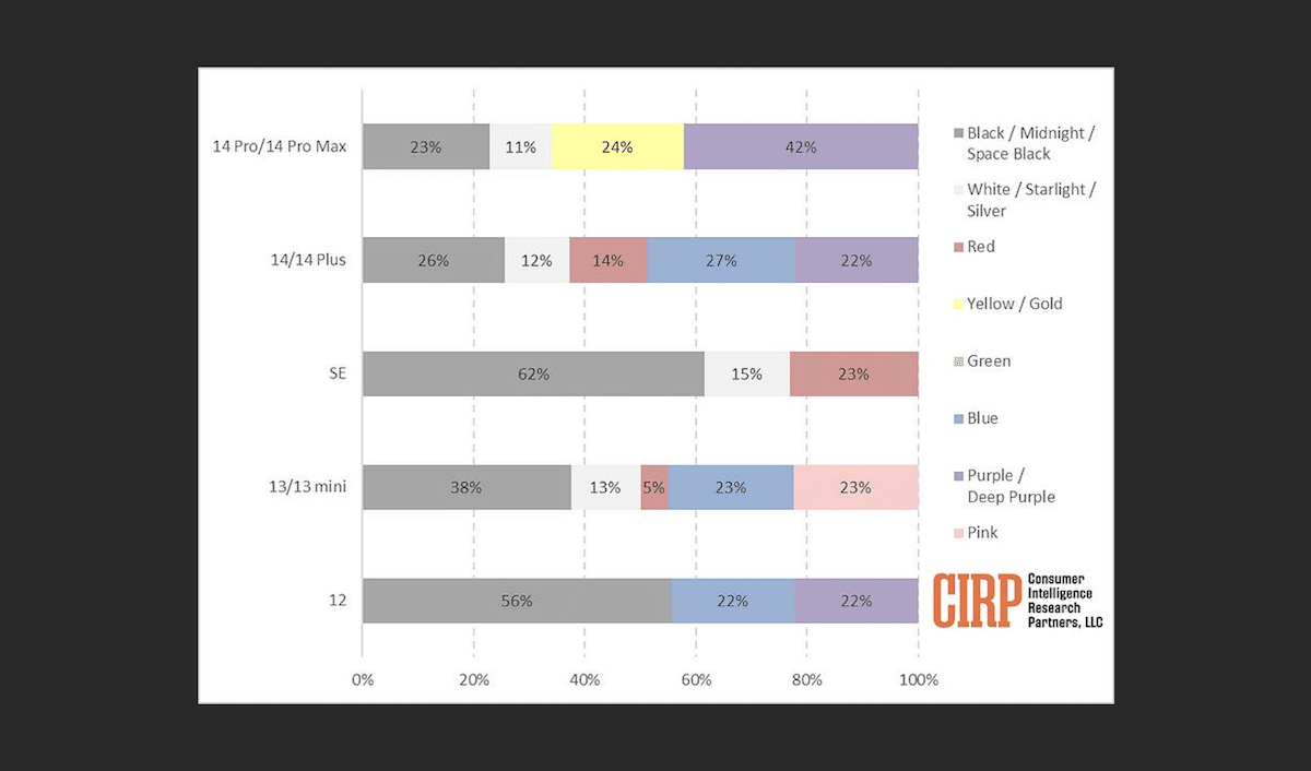 Consumer Intelligence Research Partners '(CIRP)Appleの顧客が好むiPhone色の最新の分析により、iPhone 14の「珍しい」色のオプションが流行していることが明らかになりました。