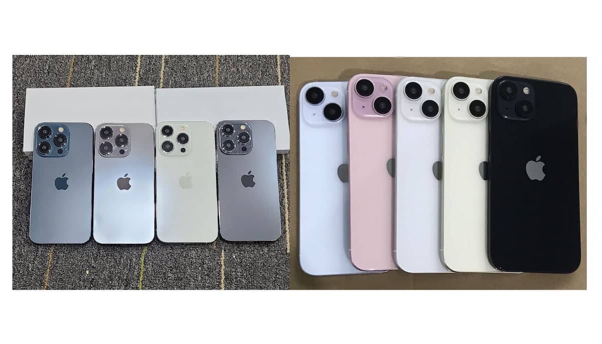 iPhone 15および15 Plusダミーユニットの画像は、噂に反論する標準的なラインナップのパステルカラーを示しています。