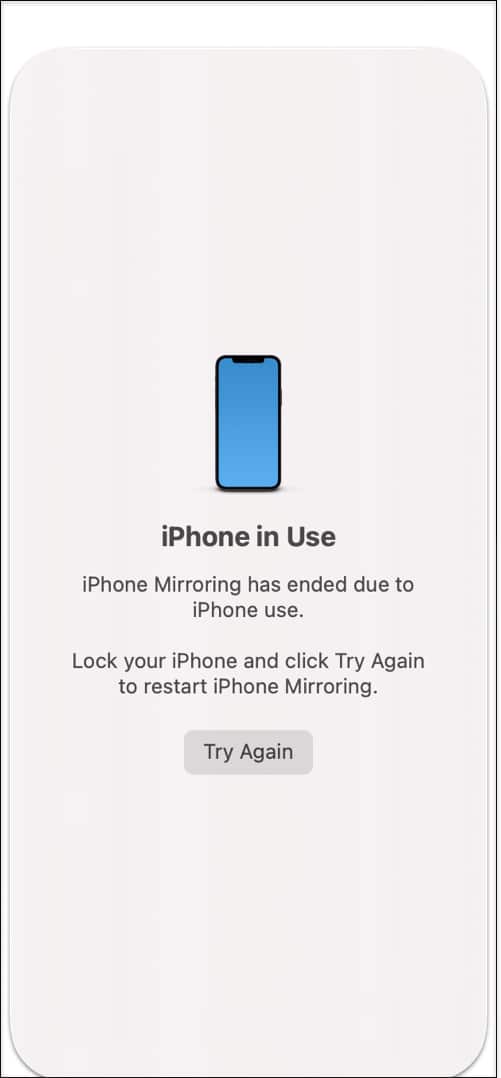 また、それを示す警告メッセージも表示されます「iPhoneミラーリングはiPhoneの使用により終了しました」iPhoneをロックしてiPhoneミラーリングを再起動するようにアドバイスしながら。
