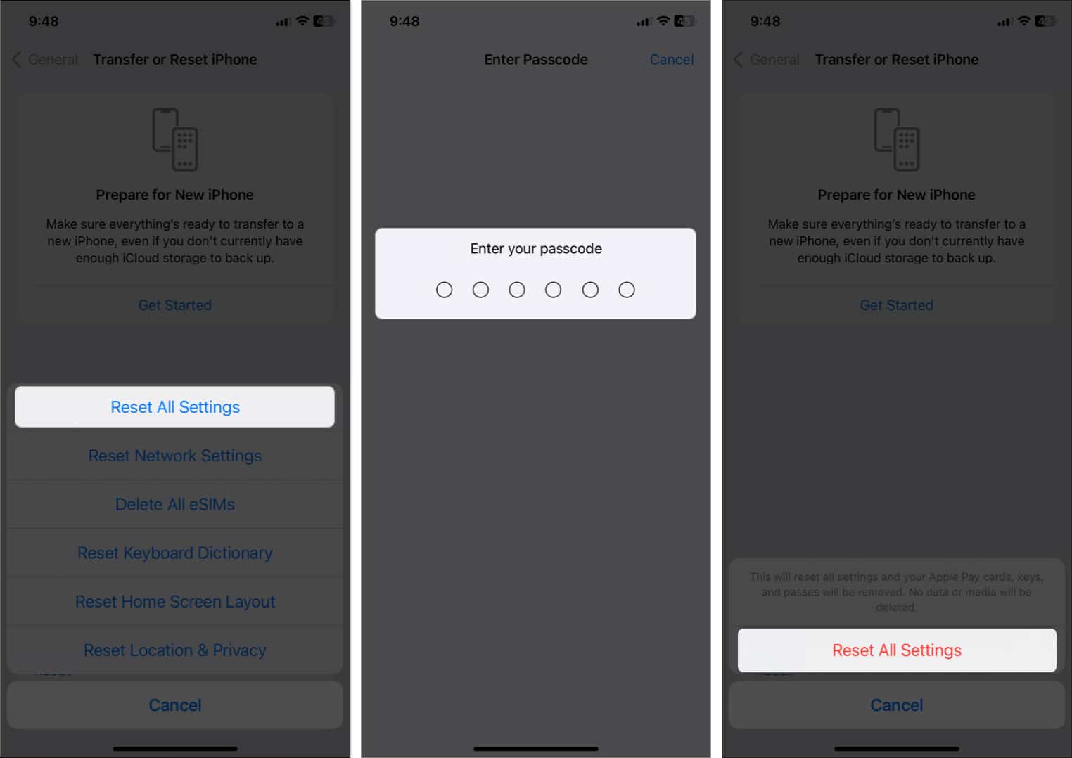 iPhoneの設定をリセットするには、開きます設定。次に、に行きます一般的な→iPhoneを転送またはリセットします→リセット→すべての設定をリセットします。次に、iPhoneパスコードを入力してタップしますすべての設定をリセットしますあなたの選択を確認します。