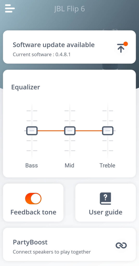 アプリは、スピーカー自体と同じように、シンプルでユーザーフレンドリーです。でイコライザ、微調整しますベース、ミッド、 そしてトレブル。また、アプリを使用して、フリップ6の名前をカスタムの名前に変更することもできます。