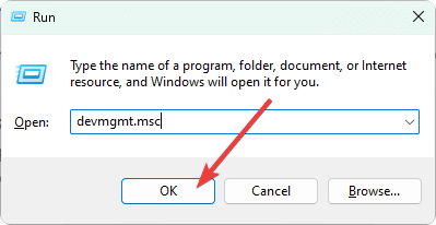 - Win + Rを押して実行し、devmgmt.mscを入力し、[OK]をクリックしてデバイスマネージャーを開きます。