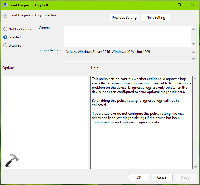 3。データ収集とプレビューの右側のペインでフォルダーを構築するには、診断ログコレクションを制限しますポリシー設定。設定をダブルクリックして、ステータスを変更します。