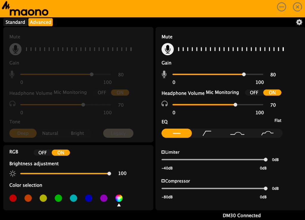 アプリでは、マイクの完全な機能にアクセスできます。アプリのインターフェイスは、2つの領域に分かれています。標準そして高度な。標準のタブにはいくつかの基本的なマイク制御がありますが、高度ではマイクの残りの設定を調整できます。 RGB照明体制を変更できるセクションもあります。 RGBのオンとオフを切り替えることができるトグル、色を選択するセクション、ランプライトの明るさを設定するオプションがあります。