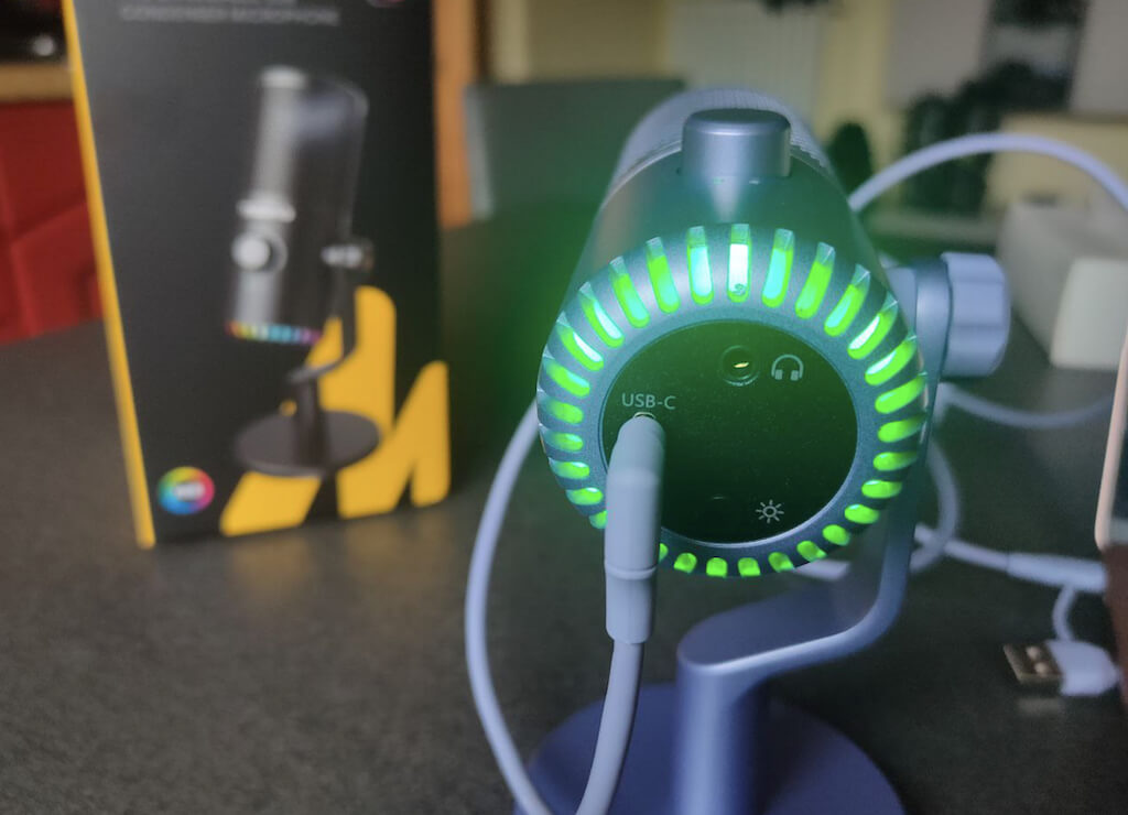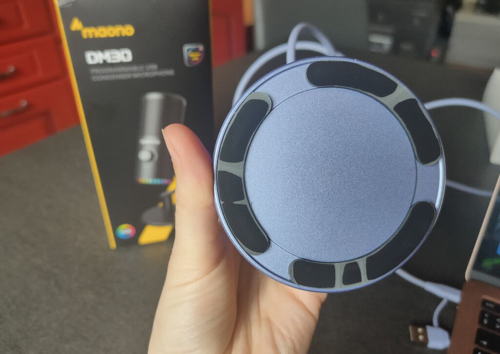 DM30の底には、RGBライト用の穴があります。レッド、オレンジ、黄色、緑、シアン、青、紫、レインボーループ、オフから選択できる9つのRGB照明モードがあります。虹色のモードは単なるループであり、呼吸やストロボのような派手な効果はありません。マイクの下部にある物理ボタンを使用して、またはMaonoソフトウェアを介してモードを切り替えることができます。