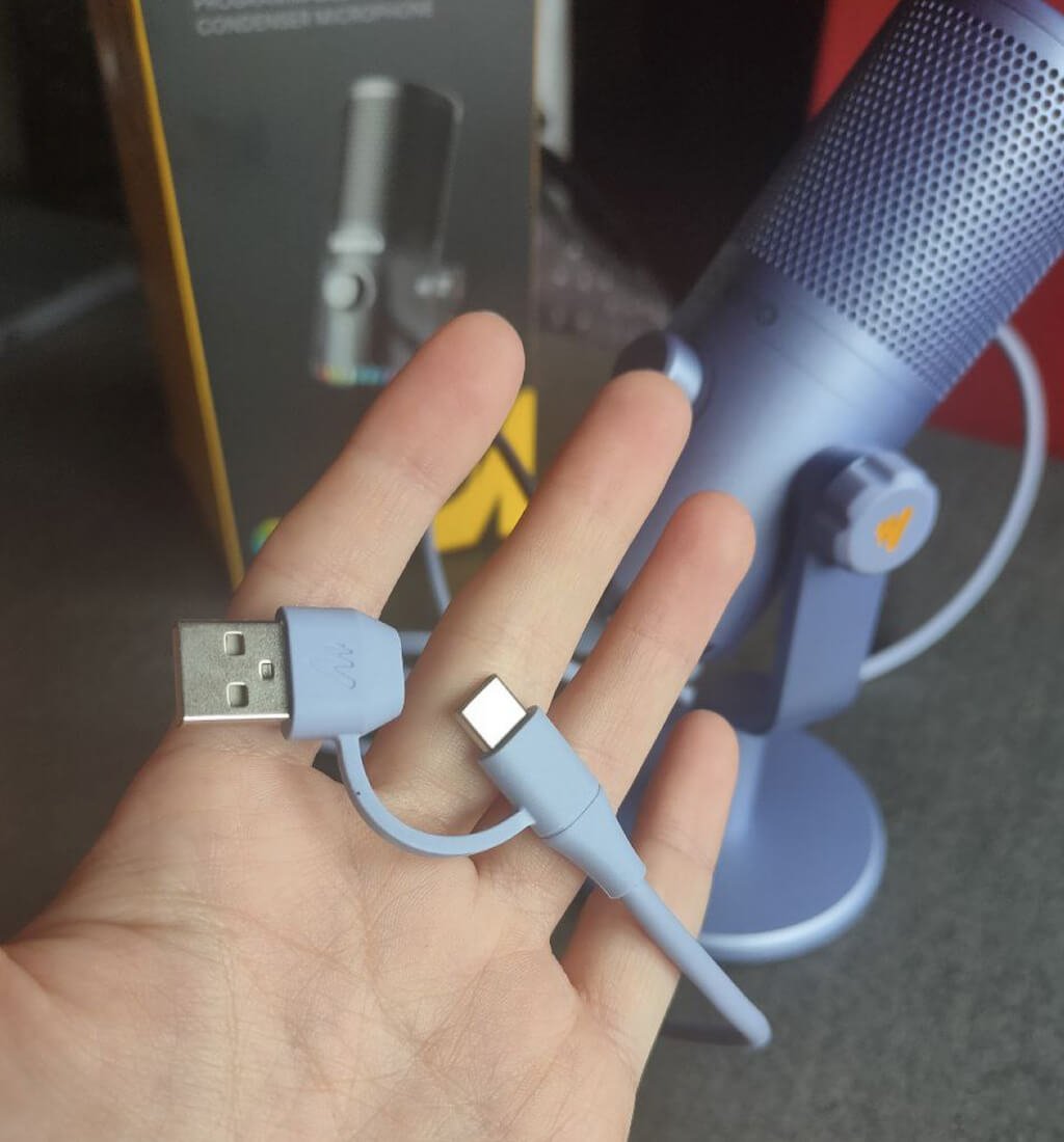 マイクの下部には、USB-Cポート、3.5mmジャック、RGB照明を制御するボタンがあります。 DM30に付属のUSBケーブルは、USB-Cポートを備えたスマートフォンやUSB-Aポートを備えたコンピューターなど、さまざまなデバイスでマイクを使用する必要がある場合に役立つ2インチUSB-CおよびUSB-Aケーブルです。ヘッドフォンジャックを使用すると、DM30がキャプチャするものをリアルタイムで監視するためにヘッドフォンを接続できます。