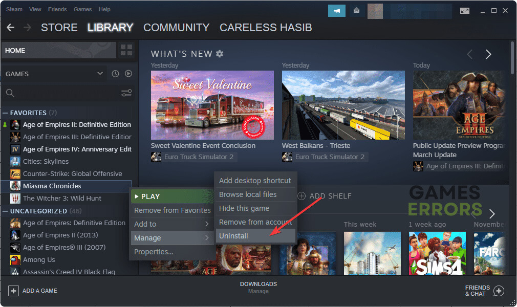- でスチームライブラリ、右クリックしますミアスマクロニクル、行きます管理、そしてクリックしますアンインストール。