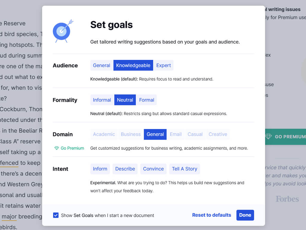 Grammarly Editorを開くと、書きたいテキストの種類とターゲットを絞っている視聴者に基づいて目標を設定するように依頼します。これに基づいて、あなたのテキストをあなたの目標にもっと調整する文法的な提案を提供します。