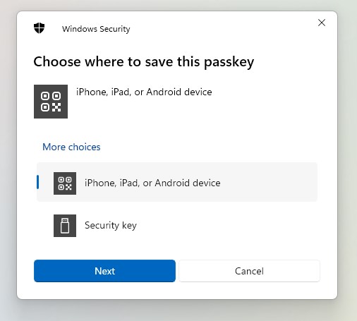 4.次に、PassKeyを保存する場所を選択する必要があります。 PassKeyを保存する方法は3つあります。携帯電話のようなものを使用する場合は、携帯電話を必要とするか、電話を必要とするか、PINをセットアップするか、セキュリティキーオプションを選択することができます。