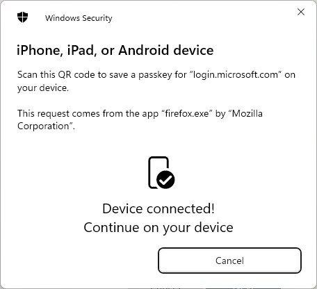 5.携帯電話のカメラアプリで画面に表示されるQRコードをスキャンすると、PassKeyを保存するように促すはずです。続行すると、デバイスにログイン資格情報を安全に保存する必要があります。