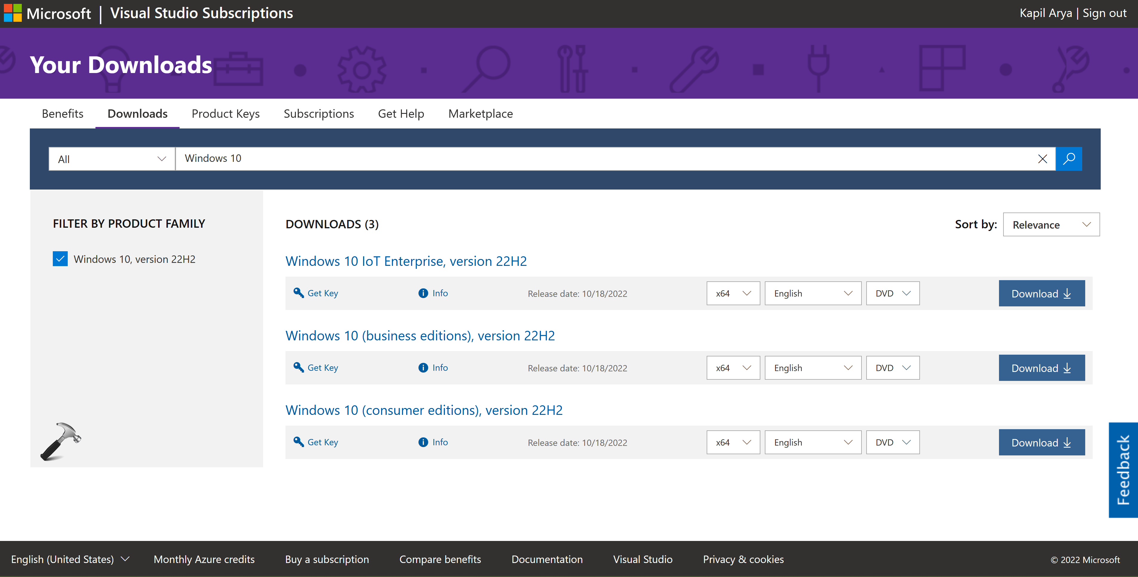 Visual StudioサブスクリプションからWindows 10 Business Editions ISOファイルを取得できます。