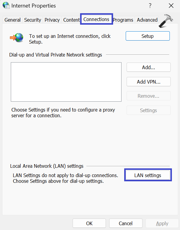 2。[インターネットプロパティ]ダイアログボックスが表示されます。に行きます繋がり[タブ]と[]を選択します。LAN設定「。