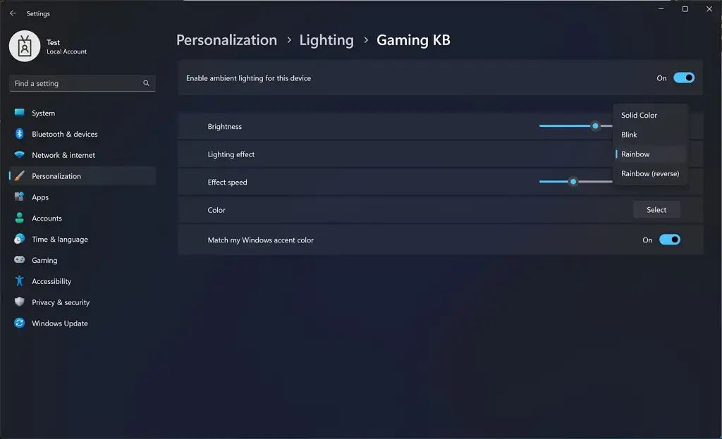 さらに、Microsoftは、開発チームが「ダイナミック照明」として知られる新機能に取り組んでいると述べています。動的照明は、ユーザーがデバイスのRGB照明を制御できるようにする新機能です。この機能は、さまざまなデバイスの照明を簡単にカスタマイズして同期できるように設計されており、画面のコンテンツに基づいて音楽に合わせてライトをパルスするなど、さまざまな効果を作成するために使用できます。