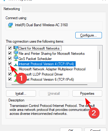 リストをスクロールして選択しますインターネットプロトコルバージョン4(TCP/IPv4)。次のチェックボックスをチェックしてから、それを選択して選択しますプロパティ。