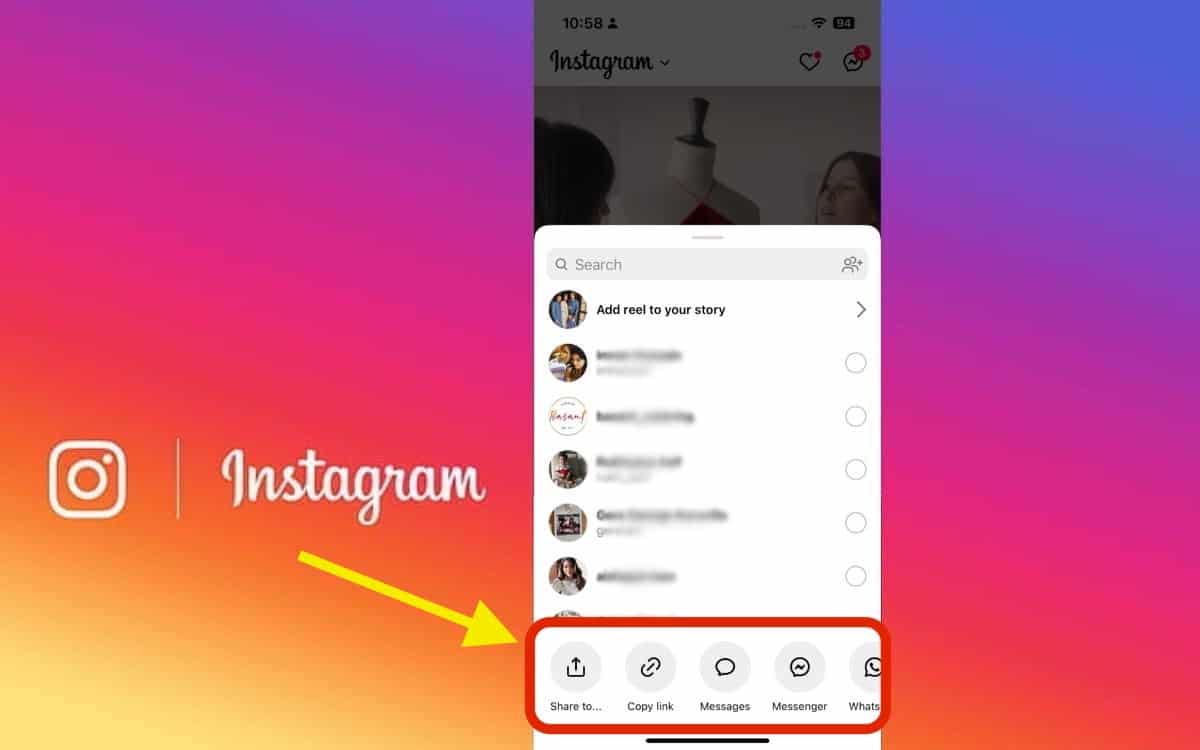 任意の投稿の下の共有矢印をタップすると、新しい共有メニューを開き、アプリで送信するアカウントを簡単に検索または選択するか、メニューの下部から希望するソーシャルメディアまたはメッセージングアプリをタップして共有します。