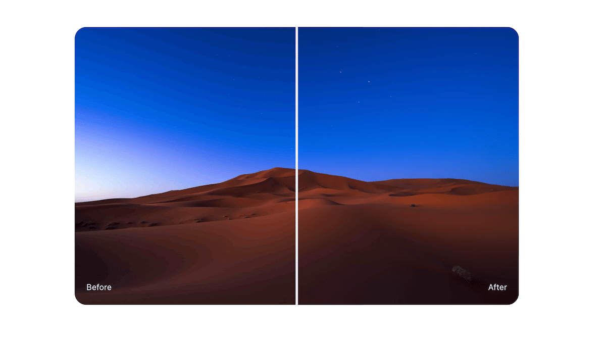 Debandアルゴリズムをトレーニングして、画像の色、勾配、テクスチャをインテリジェントに分析し、影響を受ける領域がどこにあるかを判断し、画像の他の部分でより細かい詳細に触れることなくシームレスに滑らかにしました。カラーバンドが削除された後、上の砂漠の写真のすべての小さな星が鮮明なままであることに注意してください。さらに、DeBandはさまざまな圧縮アーティファクト(たとえば、大量に圧縮されたJPEG)に取り組むため、見栄えの良い画像を楽しむことができます。