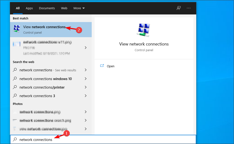 - Windowsキー + Sを押して、ネットワーク接続を入力します。選択しますネットワーク接続を表示しますリストから。
