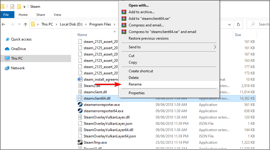 C:Program FilesSteam - 見つけますSteamClient64.dll、右クリックして名前を選択します。