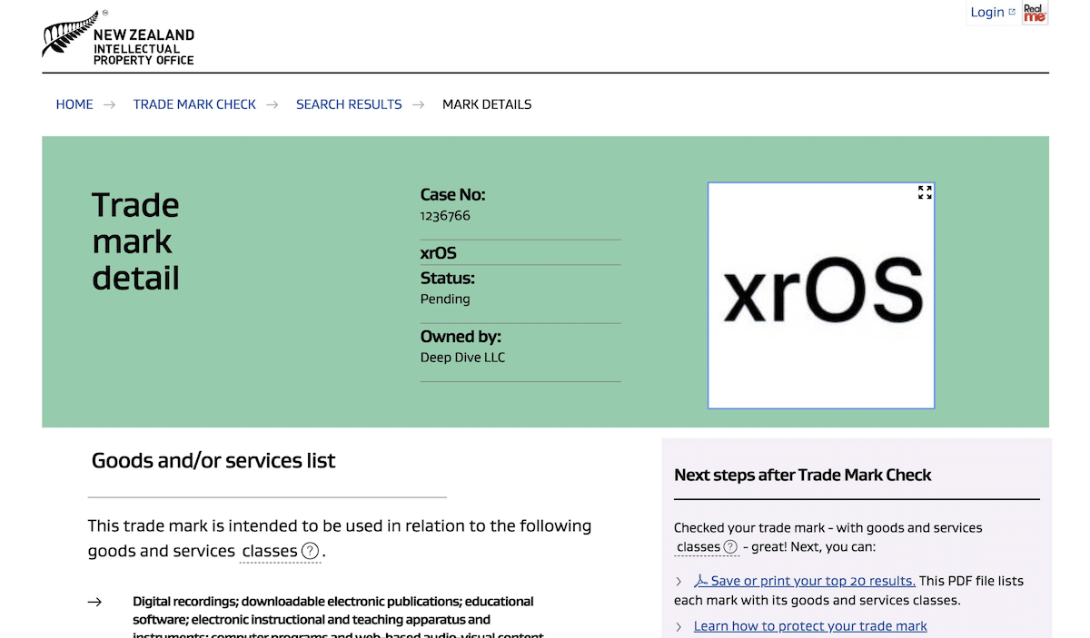現在、開発者のパーカー・オルトラニは持っています斑点ニュージーランドの知的財産局での「XROS」ワードマーク登録。 Wordmarkは、ファイリングに応じて、iOS、iPados、MacOS、TVOS、Watchos WordmarksなどのSan Fransiscoフォントまたは書体を使用しています。