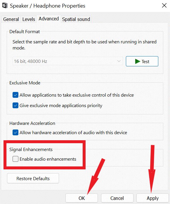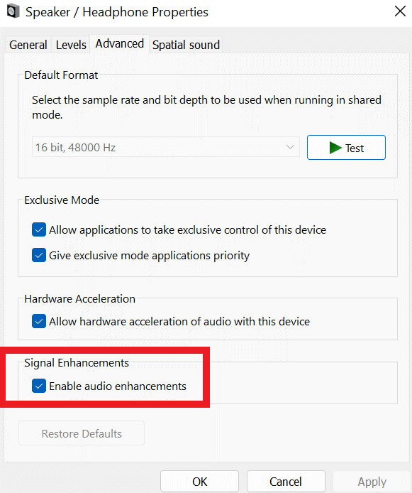 ステップ4 =の下高度なタブ、のチェックを外しますオーディオ強化を有効にします。