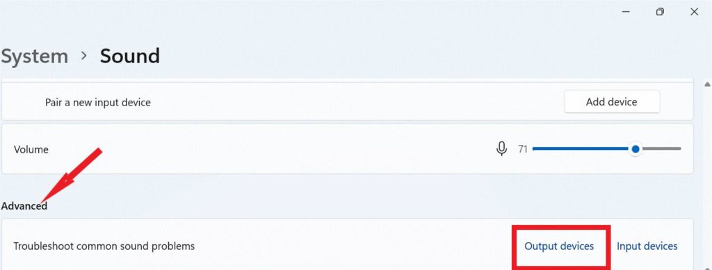 ステップ3 =サウンド設定ウィンドウ上下の下と下高度オプション、前の一般的な音の問題をトラブルシューティングしますプレス出力デバイス。