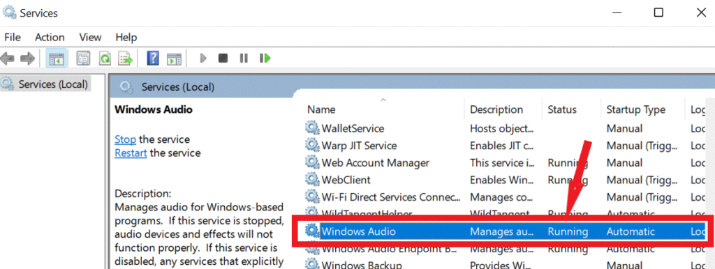 ステップ3 =サービスのリストからスクロールして探しますWindowsオーディオ。
