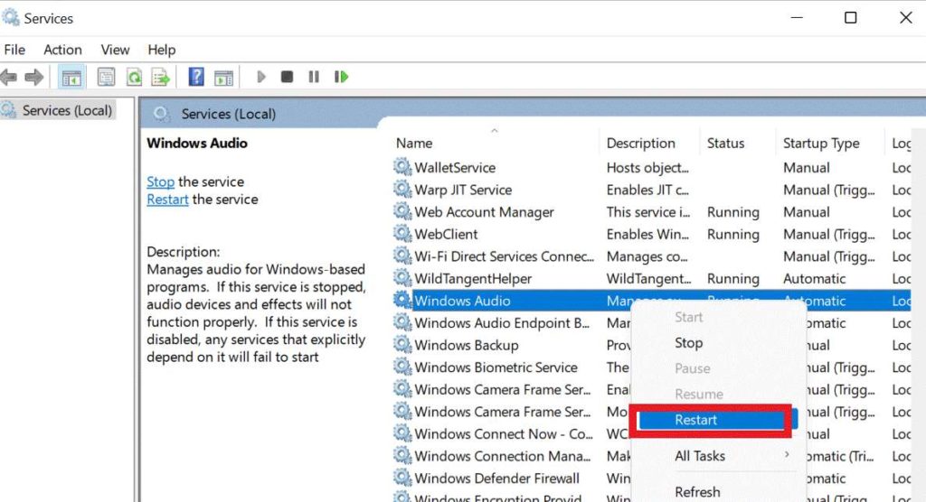 ステップ4 =Windowsオーディオサービスが現在実行されている場合は、右クリックそして、選択します再起動からのオプションコンテキストメニュー。