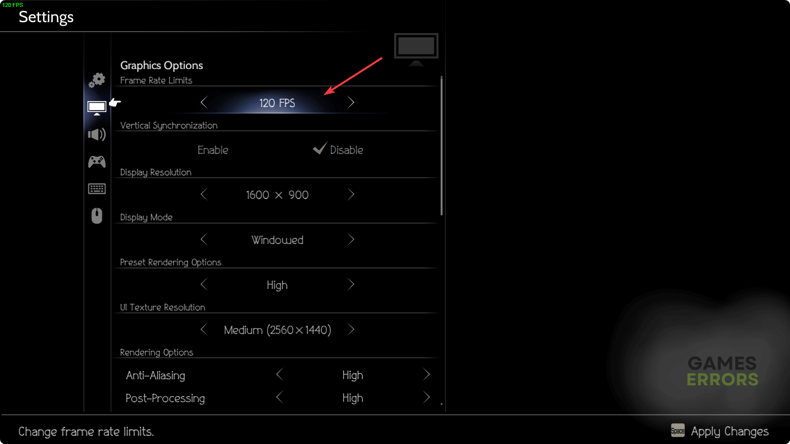 - 変更しますフレームレート制限に120または利用可能な最高のもの。